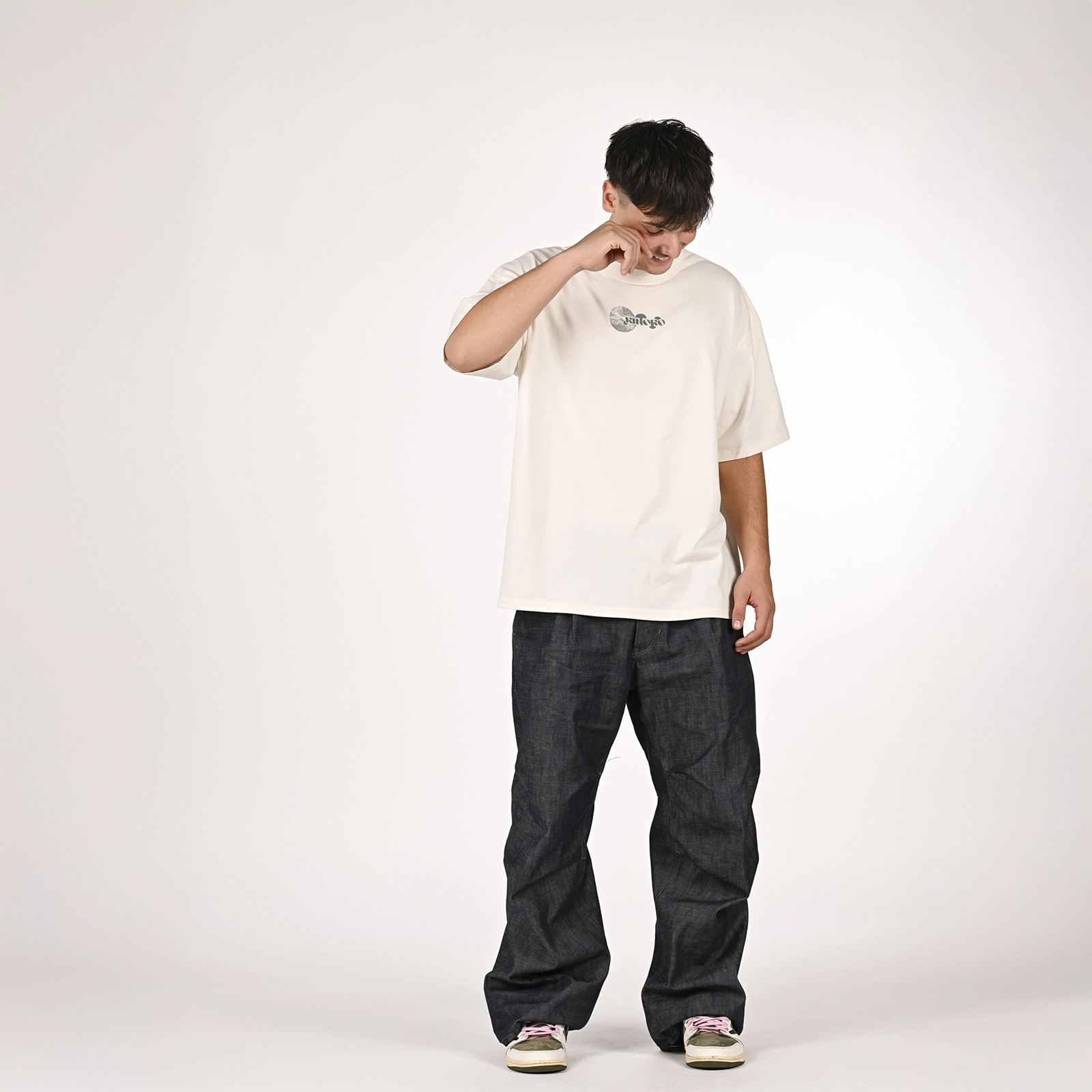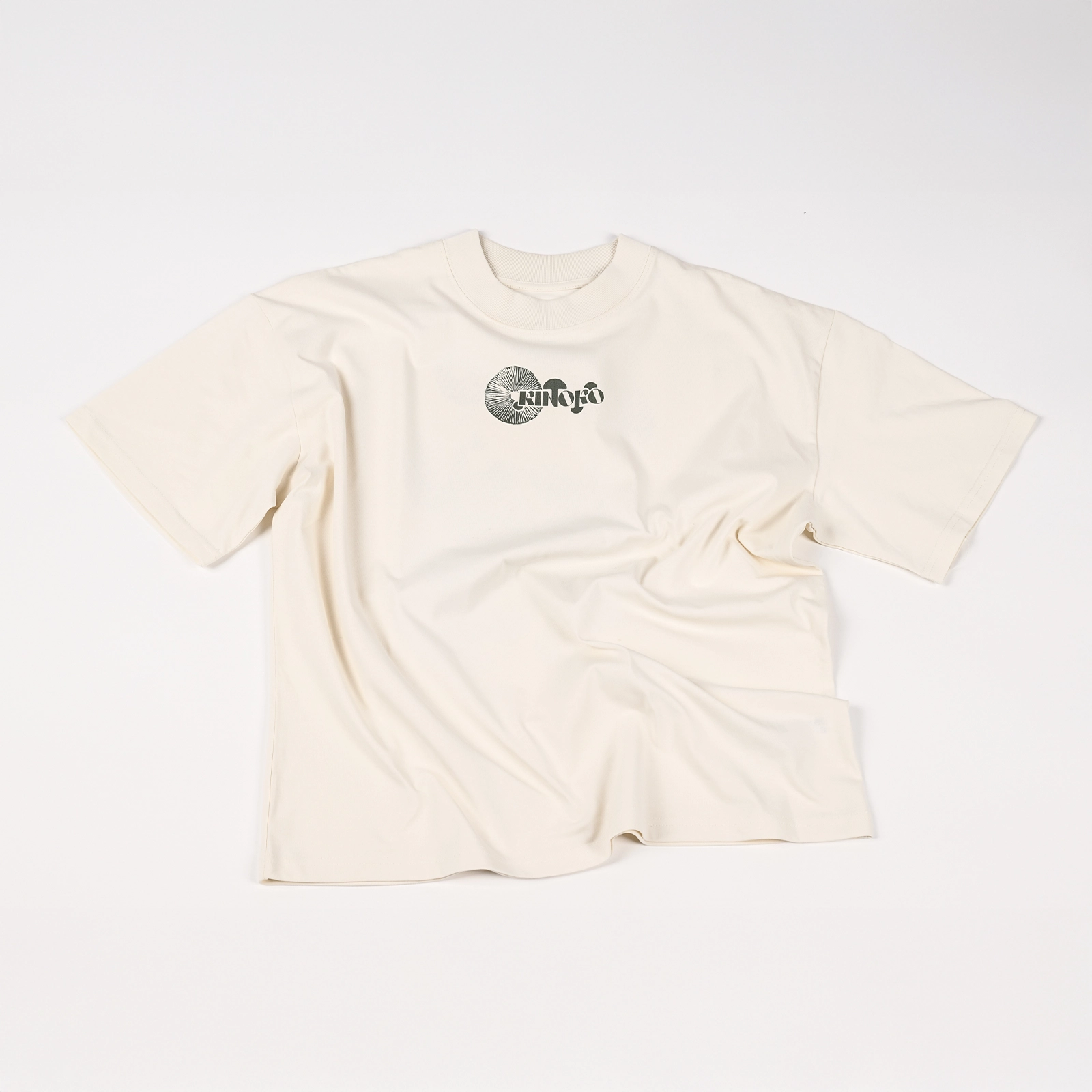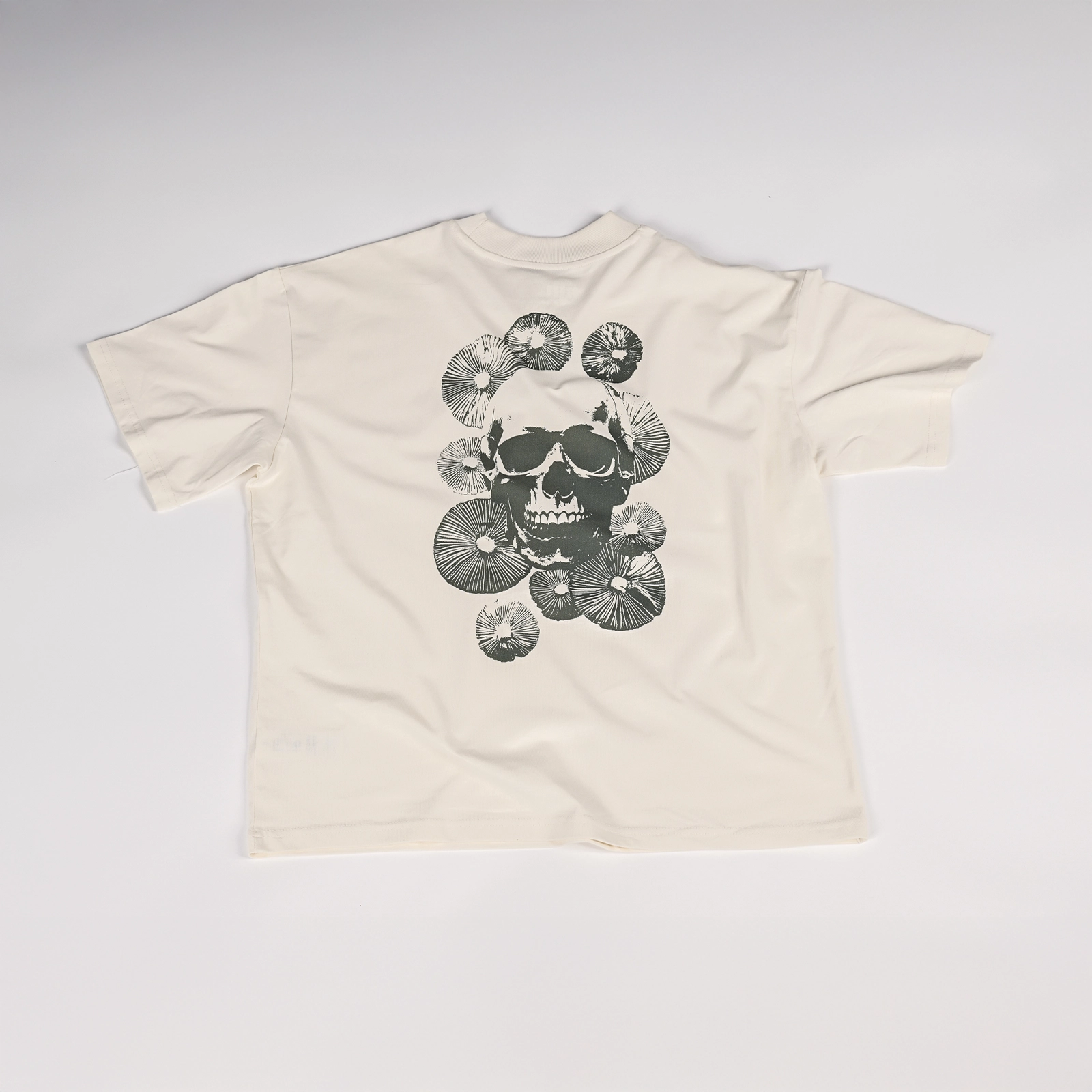 Life grows from what fades. Mushrooms sprouting from a cracked skull — renewal through decay. Printed on a cream oversized tee. Express the unseen.